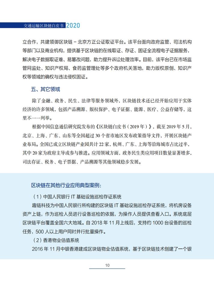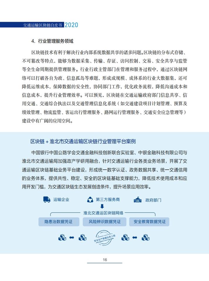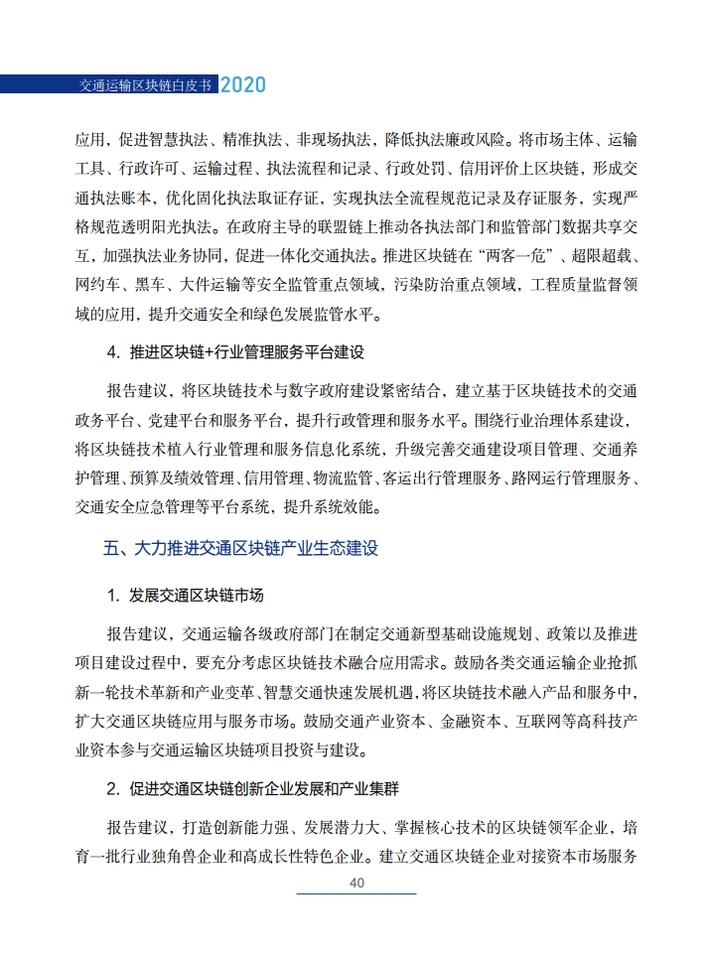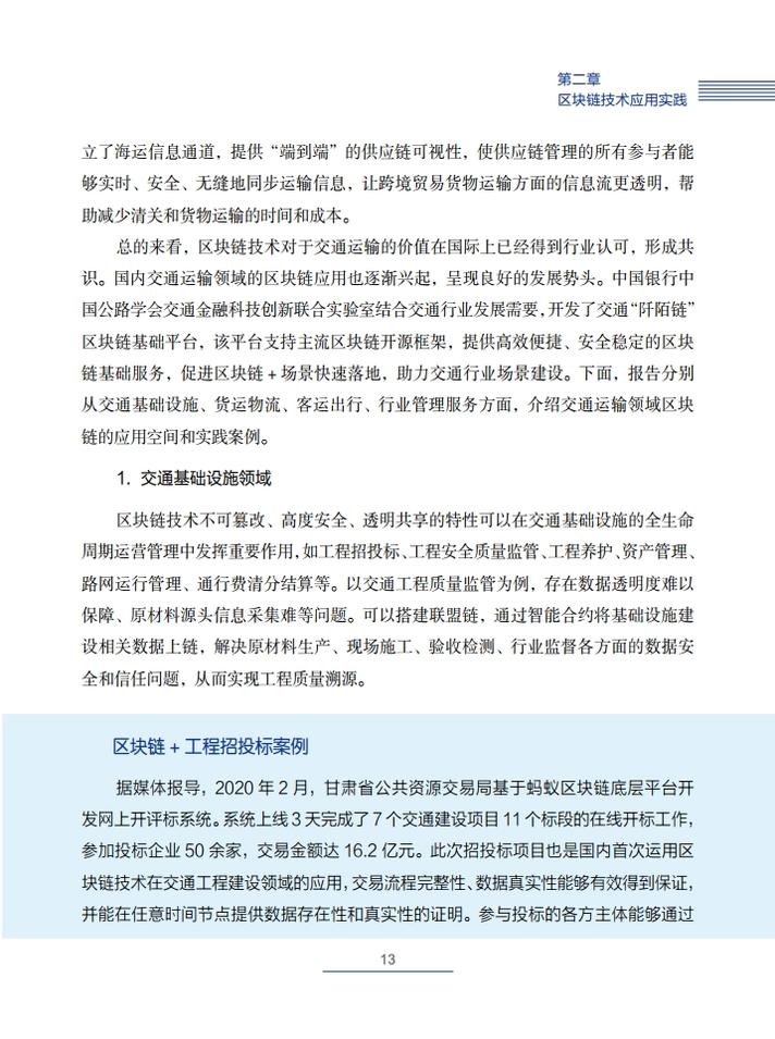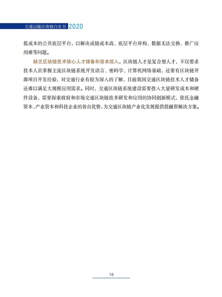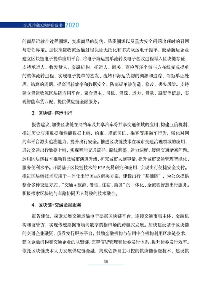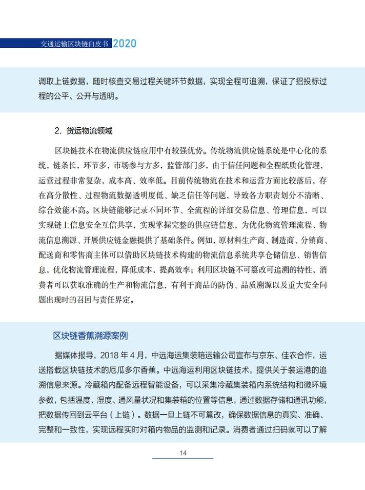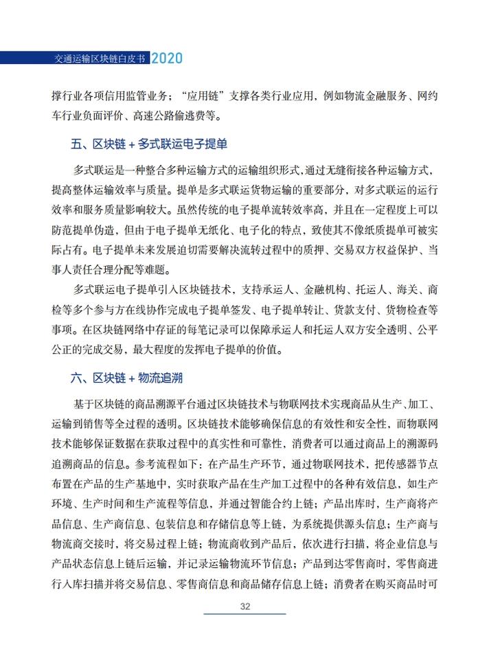 《交通运输区块链白皮书(2020)》就区块链在交通运输领域的典型应用场景,创新性地提出了技术解决方案,包括区块链+公路自由流收费、区块链+物流供应链金融、区块链+交通综合行政执法、区块链+信用交通、区块链+多式联运电子提单、区块链+物流追溯、区块链+智慧交通施工等,从技术角度论证了区块链技术在交通领域应用的可行性,并提出了投融资建议。