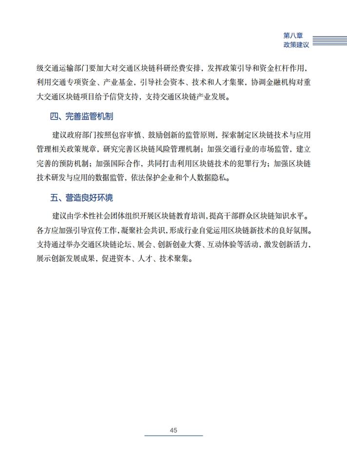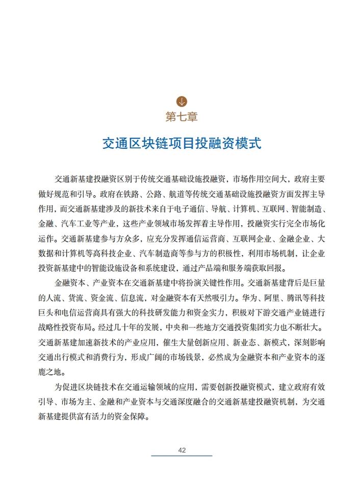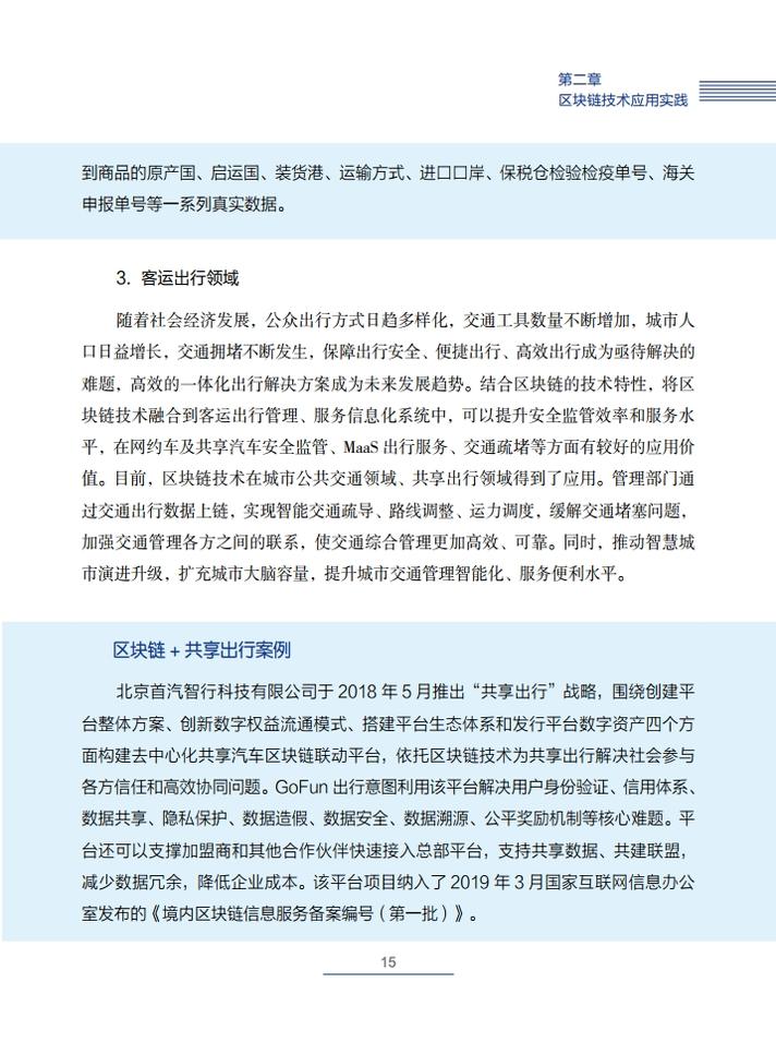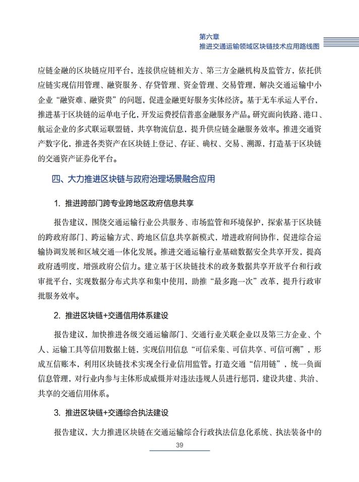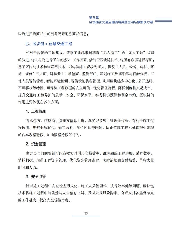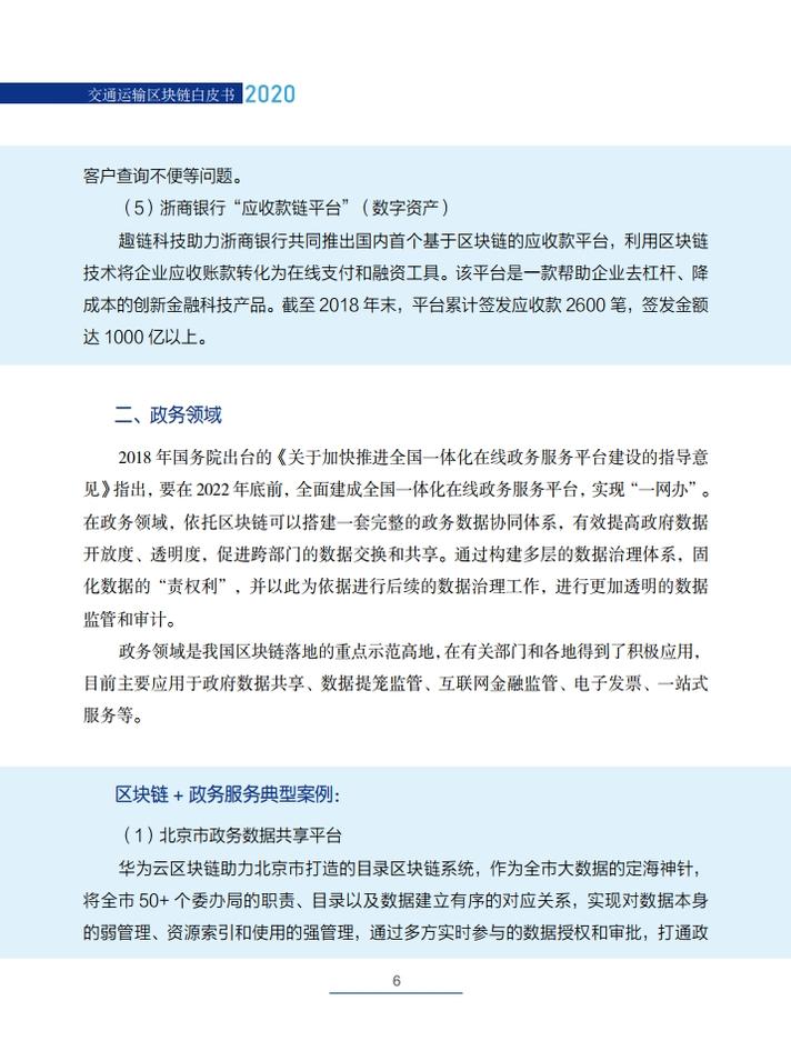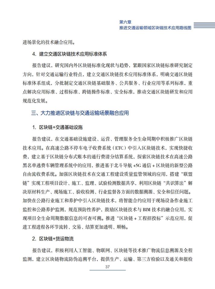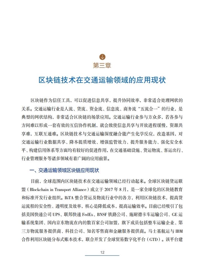 《交通运输区块链白皮书(2020)》就区块链在交通运输领域的典型应用场景,创新性地提出了技术解决方案,包括区块链+公路自由流收费、区块链+物流供应链金融、区块链+交通综合行政执法、区块链+信用交通、区块链+多式联运电子提单、区块链+物流追溯、区块链+智慧交通施工等,从技术角度论证了区块链技术在交通领域应用的可行性,并提出了投融资建议。