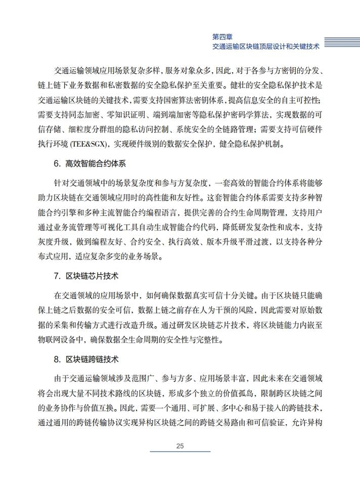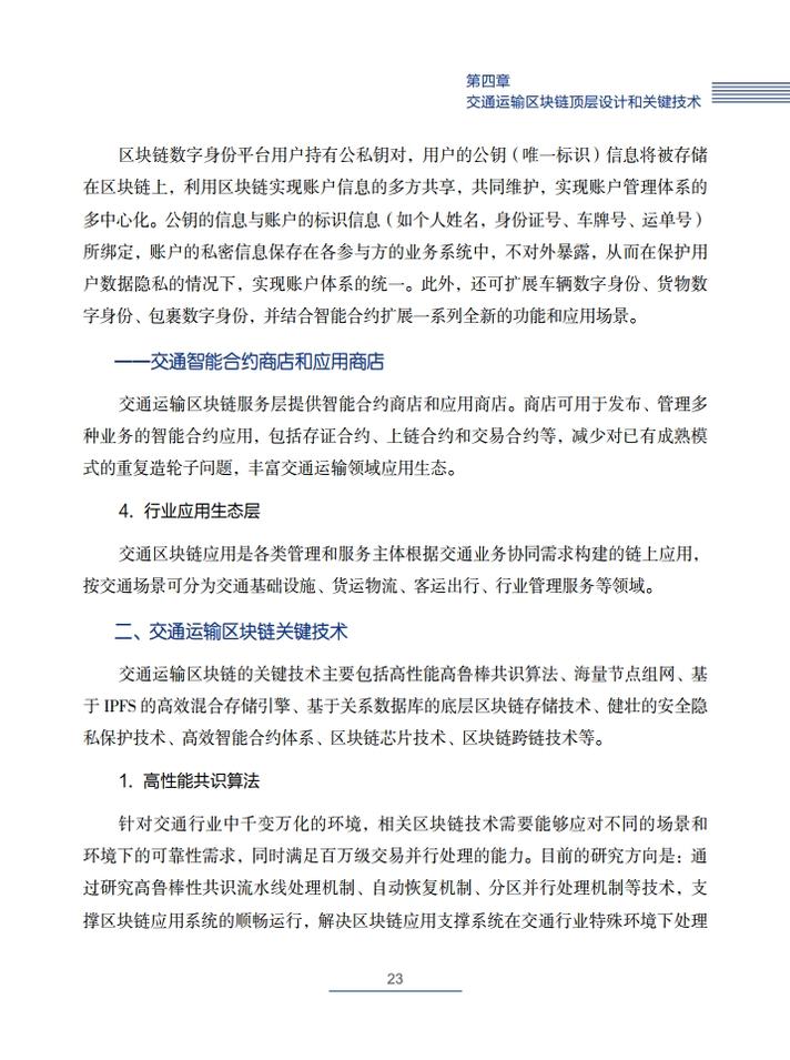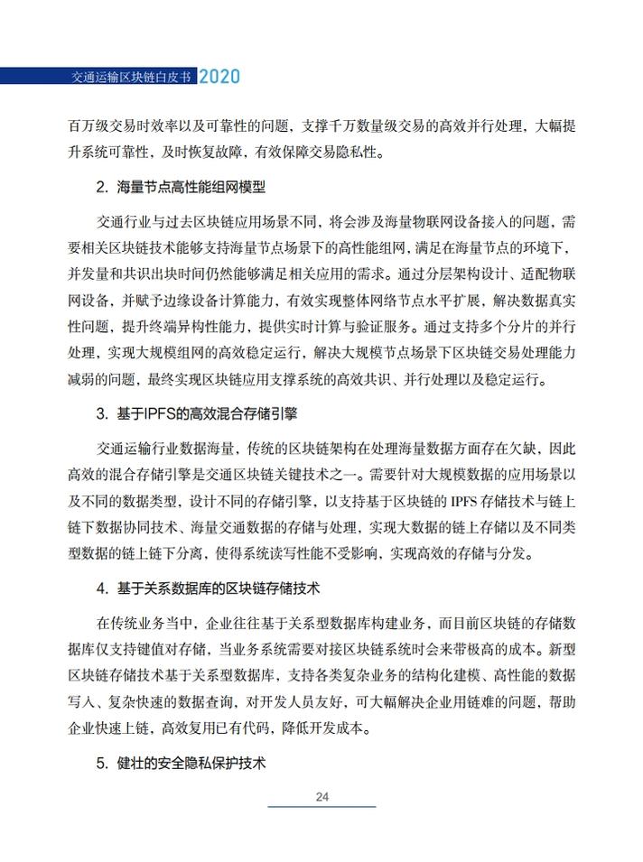 针对交通运输行业参与方众多、应用场景复杂、数据交换需求海量、跨部门跨地区跨专业信息共享难、物联网设施巨多等实际情况和特点,《交通运输区块链白皮书(2020)》提出了需要突破的交通运输区块链关键技术,包括高性能共识算法、海量节点高性能组网模型、基于IPFS的高效混合存储引擎、基于关系数据库的区块链存储技术、健壮的安全隐私保护技术、高效智能合约体系、区块链芯片技术、区块链跨链技术等。