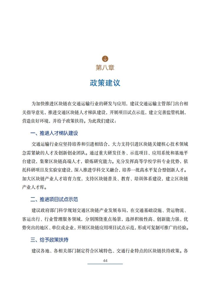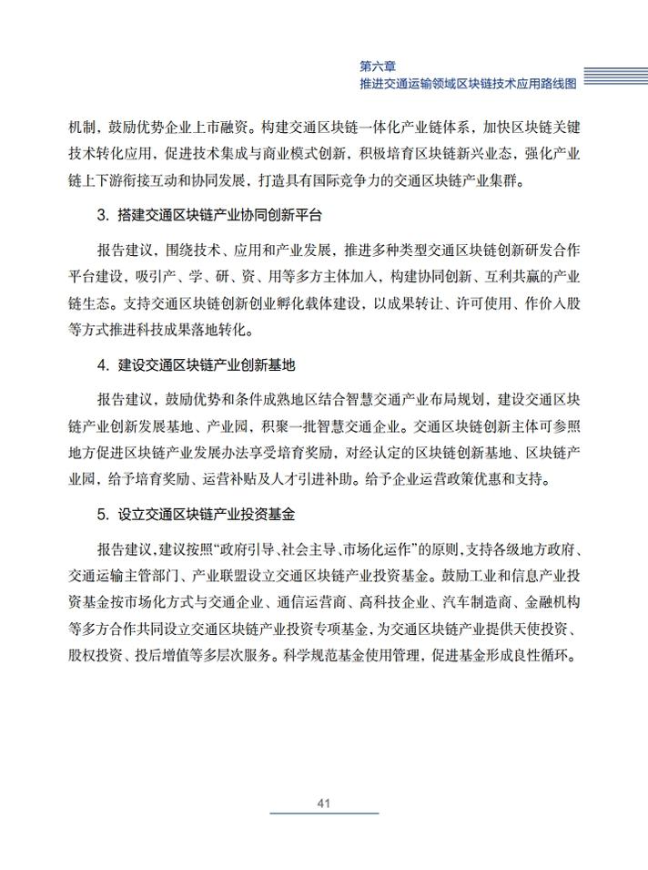 为促进交通运输领域区块链技术研发与应用,《交通运输区块链白皮书(2020)》从愿景目标、大力推进交通区块链应用基础层建设、大力推进区块链与交通运输场景融合应用、大力推进区块链与政府治理场景融合应用、大力推进推进交通区块链产业生态建设等方面,提出了交通运输区块链发展路线图,并从人才梯队建设、项目试点示范、政府政策扶持、完善监管机制、营造良好环境等角度向政府和市场提出了政策建议。