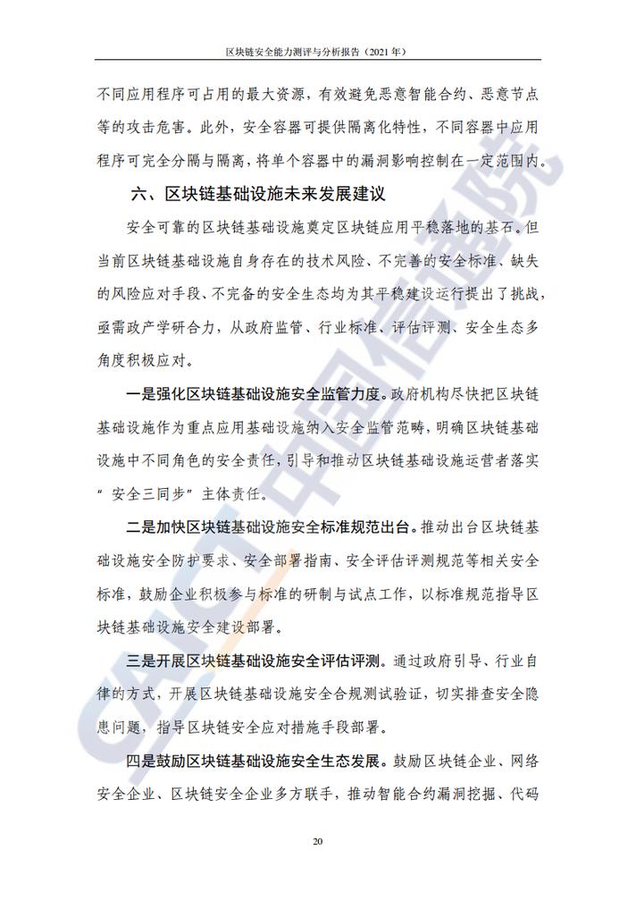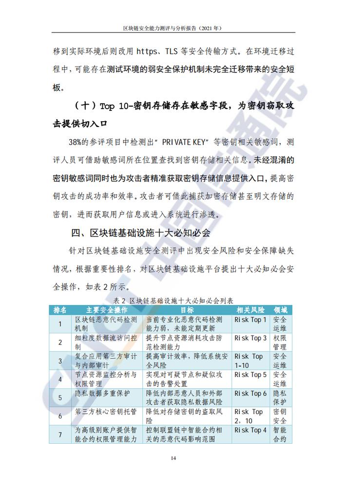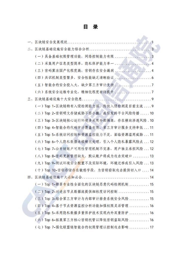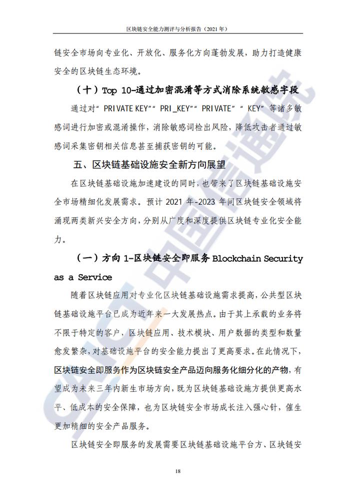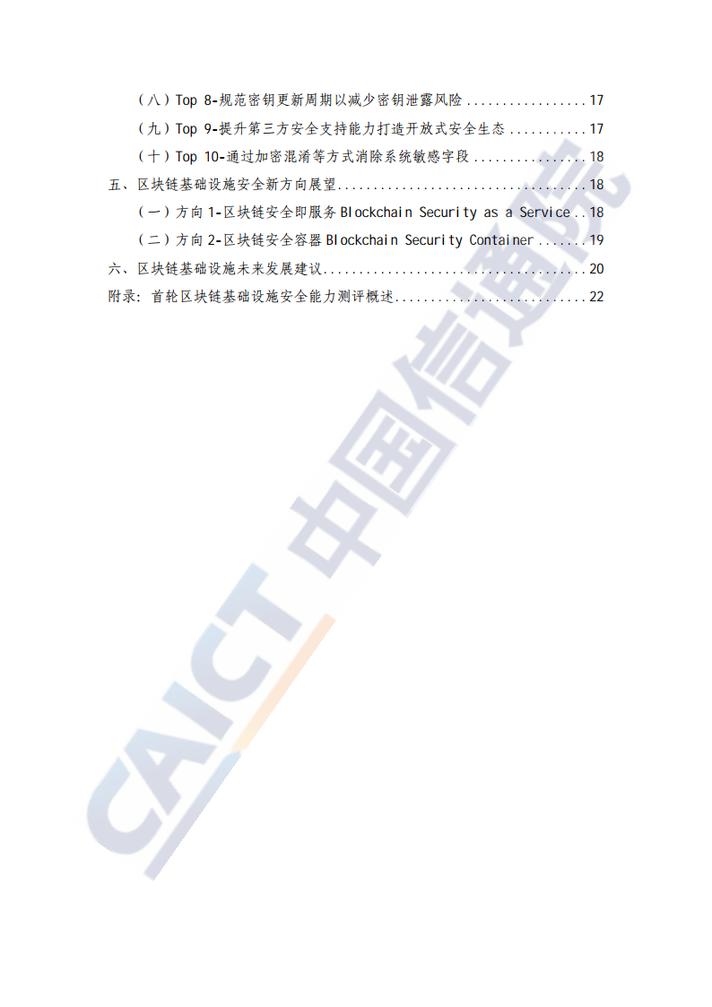 报告还通过综合评估本轮测评中安全风险的检出比例和严重程度,总结了区块链基础设施十大安全隐患,并针对区块链基础设施安全测评中出现的安全风险和安全保障缺失情况,提出了区块链基础设施十大必知必会。报告最后对2021-2023年间区块链基础设施安全新方向进行了展望,提出了未来区块链安全发展建议。