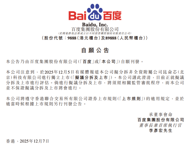 12月8日消息,昨日晚间,百度在港交所发布公告:于2025年12月5日有媒体报道本公司拟分拆非全资附属公司昆仑芯(北 京)科技有限公司进行独立上市(“拟议分拆及上市”)。本公司谨此澄清,目前正就拟议分拆及上市进行评估。倘进行拟议分拆及上市,将须经相关监管审批程序,而本公司并不保证拟议分拆及上市将会进行。