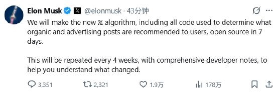 埃隆•马斯克近日宣布,X平台将在未来七天内向公众开源其新版算法,该算法决定向用户推荐哪些帖文及广告。据马斯克介绍,X平台将附上详尽的开发者说明文档,帮助公众理解算法的具体更新内容,并承诺每四周更新一次代码。